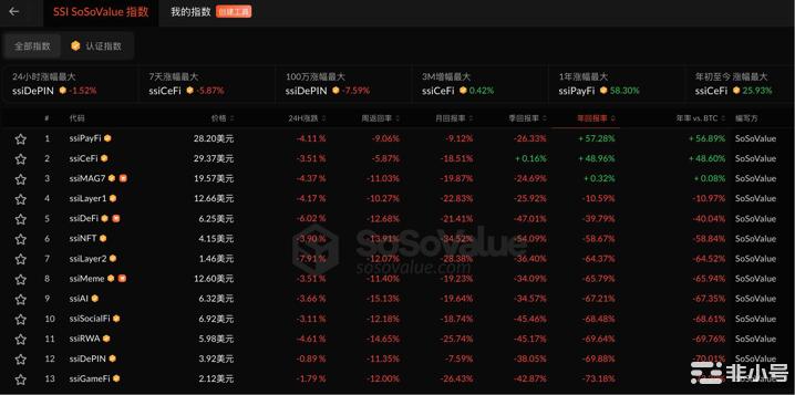 SoSoValue 数据显示,加密市场各大板块无一幸免,集体下跌,24 小时跌幅普遍超过 3%。其中尤以 Layer2、DeFi 板块最为惨烈,跌幅分别达到 7.9% 和 6%。其余板块中 PayFi 板块跌幅达 4.11%、CeFi 板块跌幅达 3.51%、Layer1 板块跌幅达 4.17%、NFT 板块跌幅达 3.90%、Meme 板块跌幅达 3.51% 和 AI 跌幅达 3.66% 等。由此可见,加密市场的下跌之势远比预期来得更加迅速和猛烈。