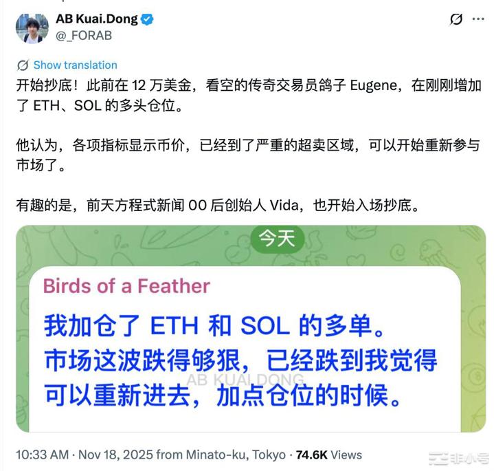 交易员 Eugene Ng Ah Sio 今日在个人频道发文称,「已增持以太坊和 SOL 的多头仓位。摆动指标已经明显回到超卖区间,我认为可以开始重新增加这个市场的风险敞口。」