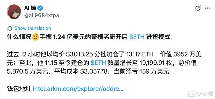 以以太坊为例,据 X 用户 Ai 姨监测,「0x1fc7」开头的地址在过去 12 小时内以 3013.25 美元均价分批加仓了 13117 枚以太坊,价值约 3952 万美元。该地址自 11 月 15 日至今已累计建仓 19199.91 枚以太坊,总价值约 5870.5 万美元。不仅如此,过去一周,以太坊财库公司 BitMine 通过 Galaxy Digital、FalconX 和 Coinbase 总计增持 67021 枚以太坊,价值约 2.3447 亿美元。