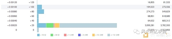 上图截取自比特目前区块中的未确认交易,当你支付的手续费小于0.0002个btc时(按目前价格约1.8美元),那么有一半以上的几率是要等10个小时或以上,这还是网络比较顺畅的时候。