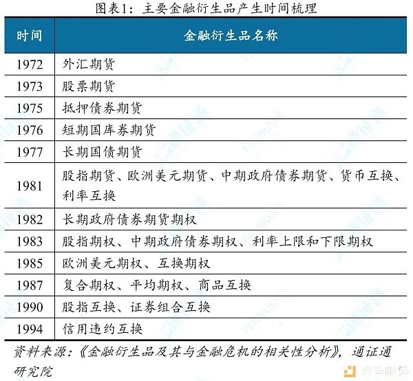 由于国际金融风险加剧、金融全球化不断深入和信息科技进步等原因,金融衍生品层出不穷,逐渐形成种类广、数量多的基本局面。1972年美国芝加哥交易所率先推出6种货币的期货合约,1973年出现了股票期货,1975年产生了抵押债券期货。据国际清算银行统计,到1994年国际市场已拥有基础金融衍生品1200多种,覆盖实物、货币、股票、债券等金融市场,基于此创造的更复杂的金融衍生品达到2万余种。