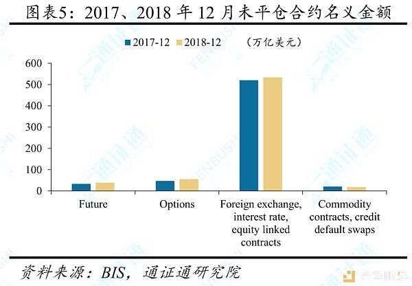 虽然近年来场外衍生品交易规模有下降趋势,但其总量依旧远超场内交易。据BIS,场外衍生品未平仓合约名义金额自2013年下半年达到710万亿美元峰值后经历反复,从2018年6月底到12月底,未平仓合约名义金额从595万亿美元下降到544万亿美元,仅略高于2015-2017年同时段均值。场内交易方面,2018年交易所期权和期货未平仓合约金额分别为47.3、33.7万亿美元,远低于场外交易规模。