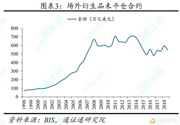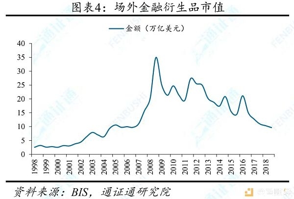 金融衍生品市值规模历经了快速扩张到逐步下跌的过程。据BIS,场外金融衍生品市值在1998年6月至2008年12月,从2.56万亿暴涨至34.94万亿美元。随后受2008年经济危机影响,总市值开始逐年下降,2018年12月为9.66万亿美元。