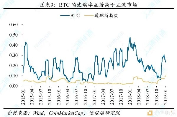 通证市场大部分标的波动性较高,风险资产属性强,加之衍生品具备杠杆特性,更易放大波动性。通证市场的规模相较初始阶段已经有了很大的增长,最高时曾超过8281亿美元,但相对而言仍是新兴市场,规模和成熟化程度较传统金融体系有较大差距。目前,通证市场尚未产生成熟的估值和定价体系,通证资产的价值常常存在巨大分歧,并发生剧烈的价格波动。2018年,通证市场就发生了一轮持续的下跌行情,总市值最低到1007亿美元,最大跌幅达87.8%,而此前2017年初至2018年高点的涨幅高达268倍,波动性远高于传统市场。在高波动性和高杠杆倍数之下,通证衍生品市场风险更大,也更易产生爆仓、穿仓等现象。