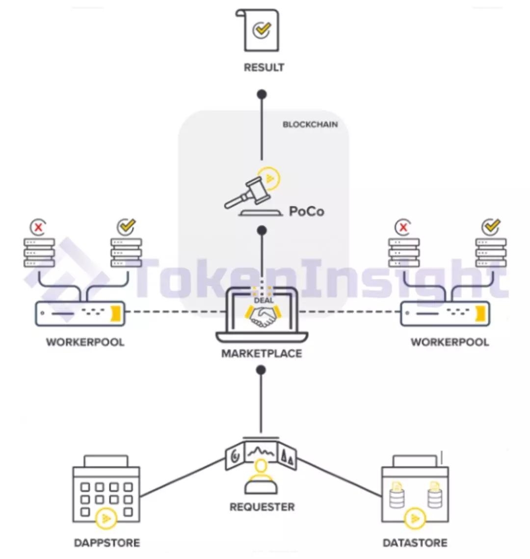 Proof of Contribution: 利用区块链不可篡改、信息透明以及去中心化的特点,iExec还设计构建了自有的贡献证明协议Proof-of-Contribution (PoCo),为整个算力生态建立了一套公开可追溯的信用与结算体系。具体来讲,PoCo可视为虚拟算力交易平台和分布式计算系统中间件(iExec Core)间的桥梁。每当平台上有人发起计算任务,各符合计算条件的节点可通过质押部分iExec平台通证参与,如果节点在计算中途退出,甚至蓄意作恶,将失去质押通证,其信用值也将受损。计算结束后,PoCo将基于各节点信用值判定计算结果是否有效,并对提供有效贡献的节点给予相匹配的通证激励。