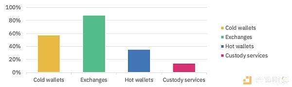 此外,热钱包(例如移动应用程序,如Trust Wallet、Coinbase Wallet)都并未被广泛用来存储资金,仅1/3的受访者在使用。