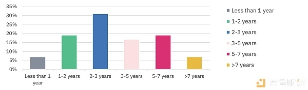 关于他们在加密资产行业的经验,大部分大型参与者都已在该行业投资数年,其中只有7%涉足该领域尚不足1整年。