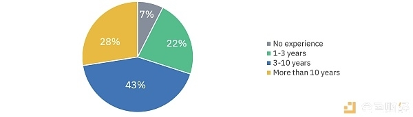 大部分受访者此前都拥有金融行业的经验,只有7%的受访者在涉足加密货币和数字资产行业之前无金融行业经验,而71%至少拥有3年传统金融行业经验。