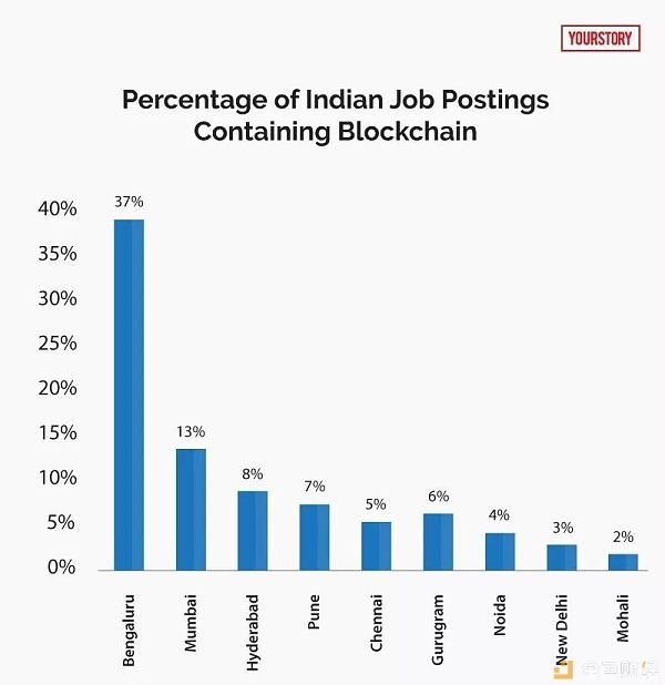 印度各地区的区块链相关职位占比,其中班加罗尔、孟买和海得拉巴排名前三