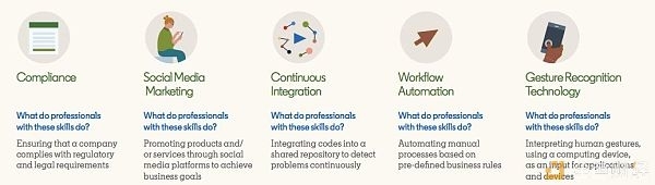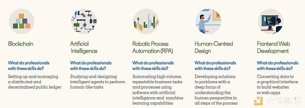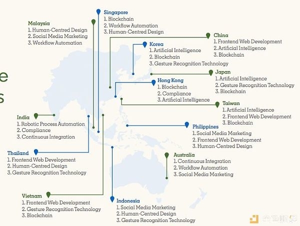 除了区块链之外,人工智能(AI)、前端开发、人性化设计、机器人流程自动化(RPA)、工作流自动化、社交媒体市场、持续集成、手势识别等技术均有上榜,同为亚洲地区需求增长最快的技术。