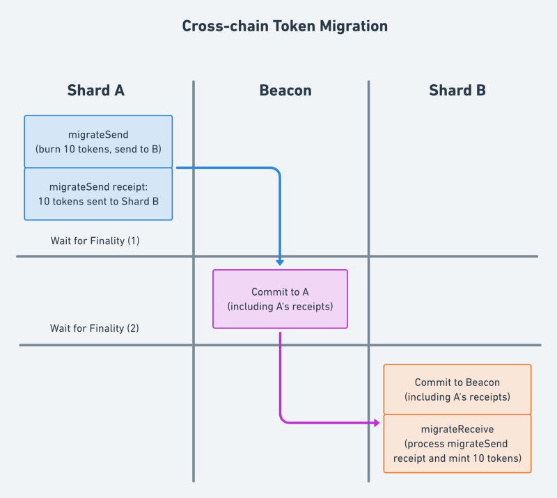 当分片 A 上的用户或合约想与分片 B 交互时,需要让分片 A 验证者委员会成员在信标链上写入关于分片的可验证信息(比如:默克尔根)。分片 A 会将它的所有收据打包到它的区块头中。信标链等待分片 A 就包含该收据的区块达成共识后,将分片 A 的区块头打包到信标链中。分片 B 等待信标链完成区块共识后,才能将包含分片 A 该区块头的信标链区块头打包进分片 B 的区块中,从而达成片内共识。如果分片 B 上的合约想要发送回复信息(也许是返回一个值或一个错误),就需要将整个过程倒过来:分片 B 生成一条收据,最终在分片 A 中生效。