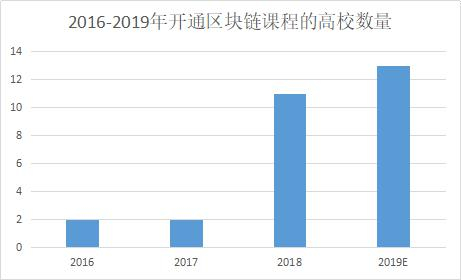与国外同行,目前相关的高端人才非常稀缺。随着区块链技术上 升为国家战略,高校增设区块链课程十分必要。我国高校很早就认识到区块链这项创新技术的应用价值,清华大学2016年就开设了相关课程,随后几年开设相关课程的高校不断增加。特别是2018年,相 比于2017年,有较大幅度的增长。