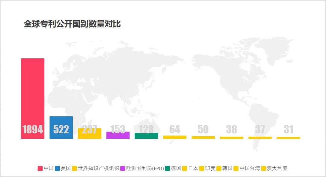 从全球视野上看,截止到2019年11月27日,根据Incopat数据库的 统计结果,在各国公开区块链专利数量中,我国的在区块链行业的专利创新位于全球领先地位,专利总数达到1894例,远超各国合计专利数量。