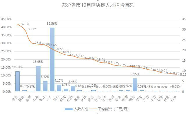 2019年三季度,招聘区块链相关人才的企业数及招聘人数分别同比下降53.68%和51.71%,需求基本集中在北京、上海和广东。虽然同比泡沫时期用人需求在缩水,但依然比2017年高出很多,且需求整体规模长期保持稳定。