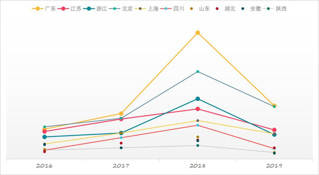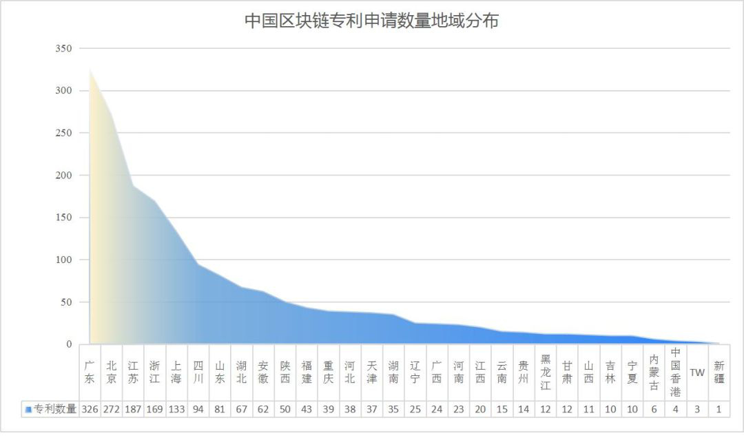 目前区块链上的专利创新申请已覆盖到国内30个省市,广东、北京、江苏、浙江、上海、四川等地在专利数量上持续领跑。这些地区除了在政策、经济贸易等社会环境上有较好的基础设施,此外,科研机构和人才优势,为这些地区的技术创新提供源源不断的动能。在2016年至2019年的的专利数量上, 始终排在各省市前列,专利申请总数达到326例,北京地区以272例位列其后。从趋势上看,浙江、北京、广东等地在2017年后,大力开发专利创新潜能。其中,以杭州、成都为代表的城市在新一轮的城市竞争中优先确立数字城市概念,在数字化社会基础设施建设和数字经济发展战略之下,为区块链技术的创新发展打下根基。