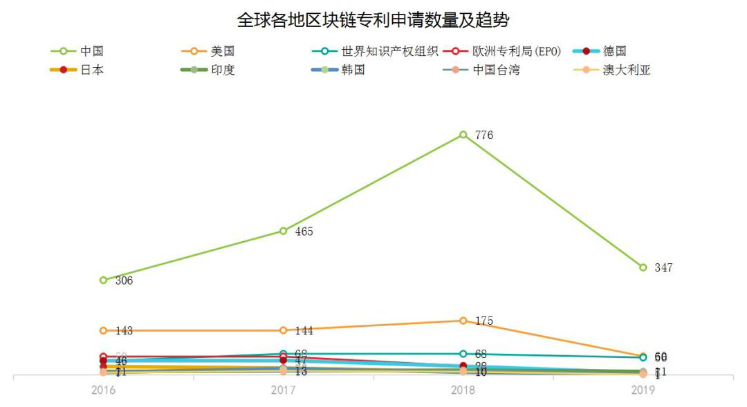 此外从趋势上观测,在2016年-2019年间,中国区块链的申请呈上升趋势,侧面反映我国在近年来正加速区块链领域的创新发展。其中, 2018年,我国的专利创新达到四年来的顶峰,专利数量为776例。此外,在2019年,受各国监管加码,行业环境趋严的状况下,各国在区块链领域的专利数量都有明显的下滑。