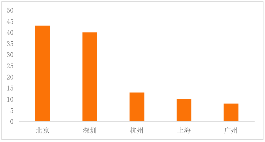 以具体的城市来看,区块链概念股在北京、深圳、杭州、上海、广州五个城市分布最多,其中,北京、深圳两地的概念股数量分别为43只、40只,与杭州(13只)、上海(10只)、广州(8只)三地拉开的距离也较大。