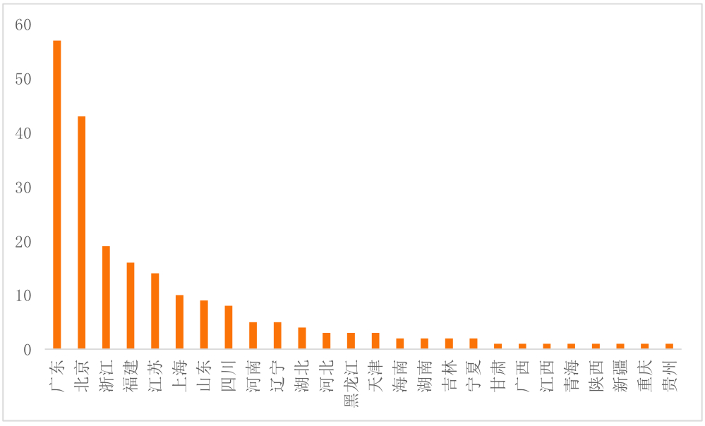 在地域分布上,企业注册地在广东和北京的上市公司在区块链领域的动态最为活跃,其中,广东省区块链概念股57只,北京43只。