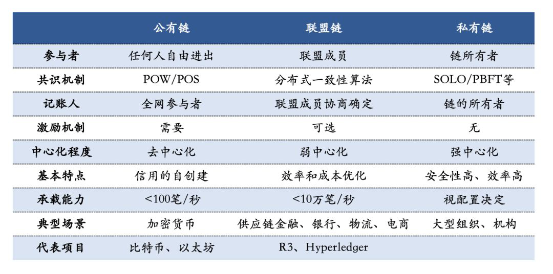 “区块链”源于比特币,但远不止比特币技术。专家、学者和工程师在比特币所代表的区块链技术的基础上进行了进一步的研究和拓展。根据对网络权限控制的区别,广义的区块链技术被分为公有链、联盟链和私有链,其中,公有链不对全网的参与者进行权限分级和管制,全网节点具有相同的地位,而联盟链则对网络访问权、记账权等则进行了限定,至于私有链则类似于企业内部管理系统,所有权限属于链的所有者。以下表格对三种区块链类型的基本特点进行链列举。