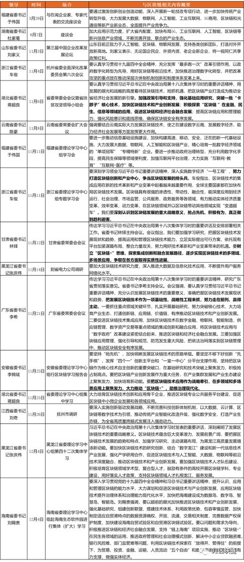 此外,2019年10月25日,在中央政治局十八次集体学习中,习近平总书记也强调构建区块链产业生态,加快区块链和人工智能、大数据、物联网等前沿信息技术的深度融合,推动集成创新和融合应用。