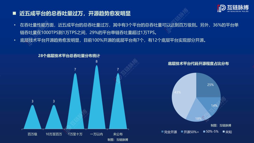 5. 性能突破方面,近五成平台的总吞吐量过万,其中有3个平台的总吞吐量可以达到百万级别。交易确认速度大大提升,多数平台都能做到秒级确认甚至毫秒级确认。
