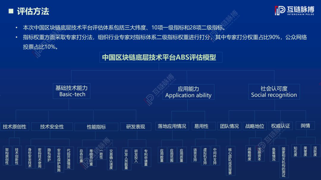 本次报告从基础技术能力、应用能力以及社会认可度三大纬度,按照10个一级指标和28个二级指标对国内28个区块链底层技术平台进行综合评估,最终得出最终结果。