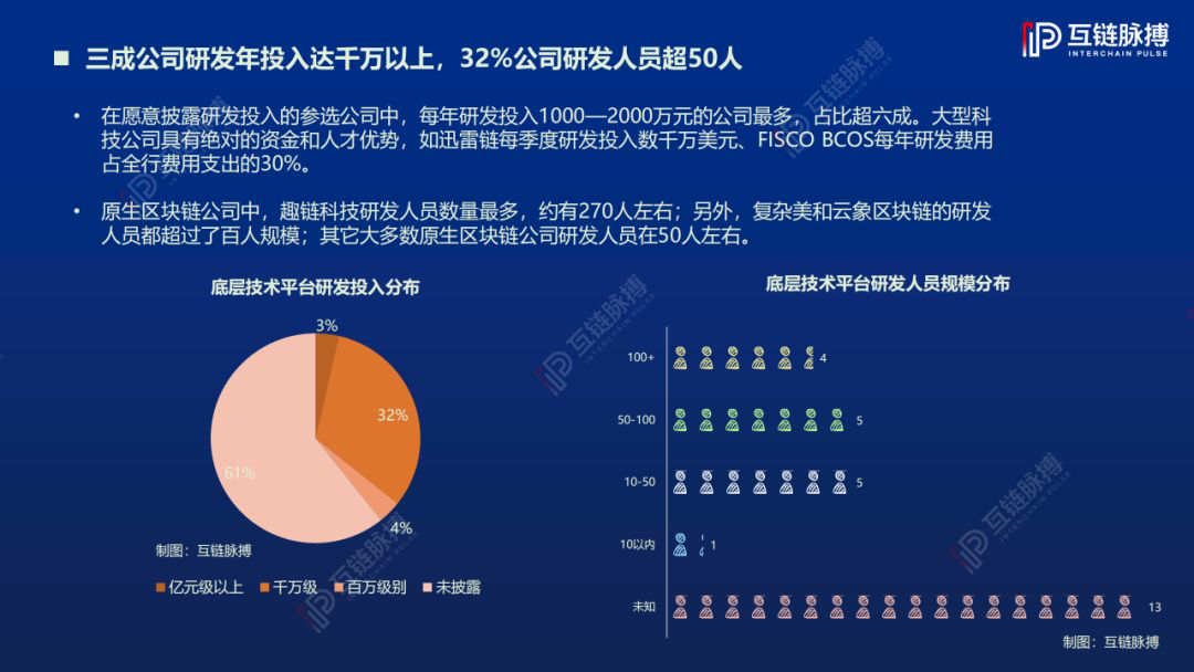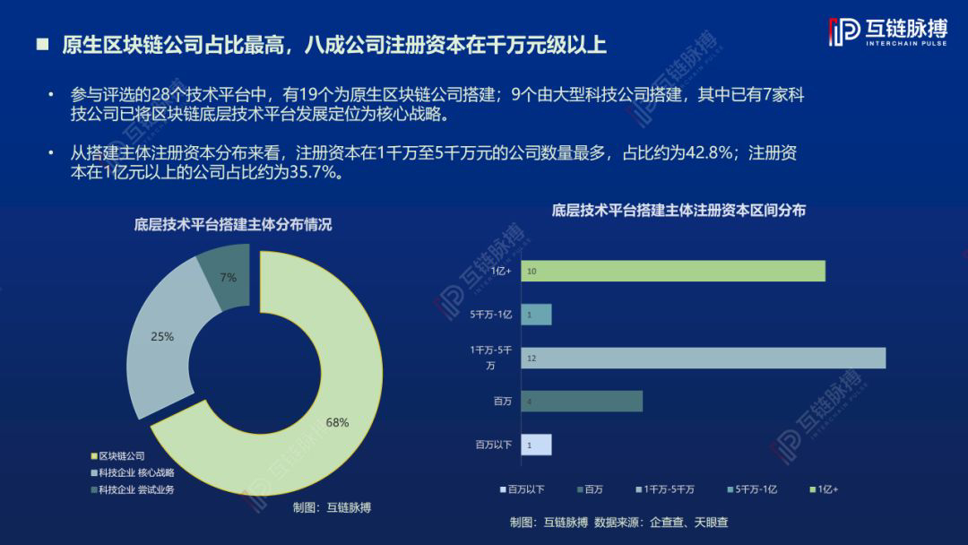 1. 报告显示,28个区块链底层技术平台中,六成底层技术平台运营时间不足2年。其中原生区块链公司占比最高,占比近七成,有9个底层技术平台由大型科技公司搭建,并且已有7家科技公司已将区块链底层技术平台发展定位为核心战略。