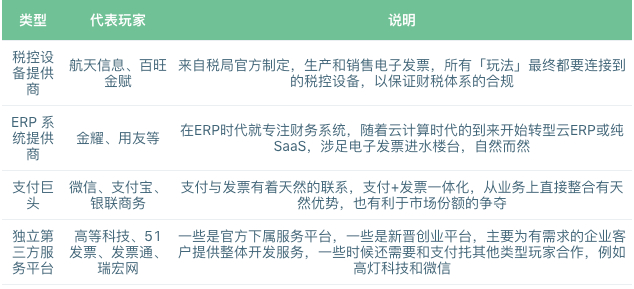 从行业竞争态势来看,税控设备提供商已经固定,作为行业「基础设施」存在。对于用友和金蝶,主要业务是企业 ERP 软件开发和系统改造,赚的是系统开发和改造的收入,没有核心垄断地位,他们提供的电子平台最后要和航天信息、百望的电子平台对接。而 ERP、支付巨头也基本无法成为潜在的进入者,独立第三方服务平台成为蓝海所在。
