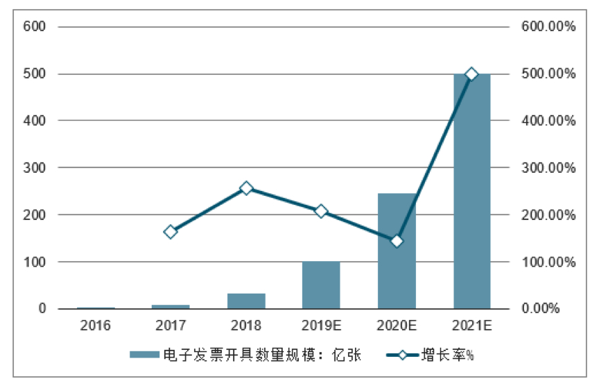 基于国家统计局,政府各部和国家经济信息中心的信息分析,中国市场每年的发票规模超过 2000 亿。近年来,电子发票业已从电子商务和电信逐渐扩展到保险,零售、餐饮、运输、公用事业等行业。从地理上讲,它也已从单个试点地区扩展到整个国家。2017 年,中国发行了 13.1 亿张电子发票,服务市场收入约为 2.48 亿人民币。2018 年全国电子发票开具数量为 32.7 亿张,较 2017 年增长了 257.1%。预计到 2022 年,电子发票市场将达到 545.5 亿张。