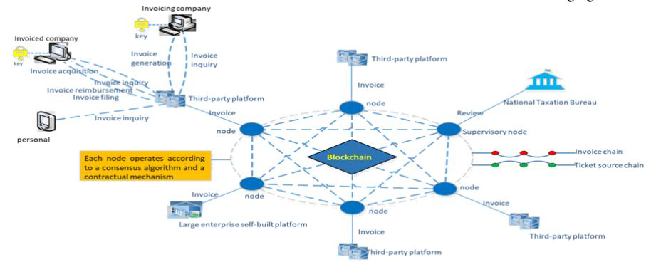 结合区块链技术,我们可以基于基于互联网的联盟链模型构建电子发票联盟链。在该区块链中,引入了税务机关在区块链系统上实施监管机制,税务机关统一制定了区块链的运营标准和合同条件,区块链中的每个节点和参与者都必须按照建立的交易规则行事。