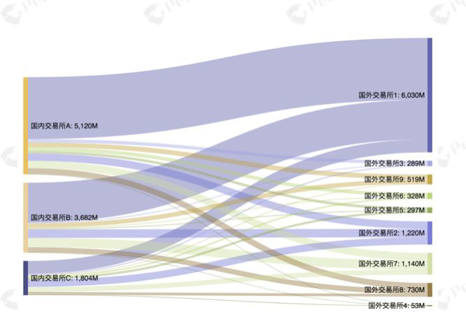 图十三是按月计算,2019年从中国流出到国外的资金量;图十四是按交易所统计,2019年从中国交易所流出到国外交易所的资金总量。