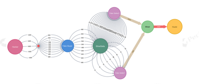 如图七所示,据 CoinHolmes 数据显示,2019年5月黑客先是将5,000枚 ETH,分批汇聚进入去中心化交易所 EtherDelta,伪装成买家卖家倒手买卖,最终汇聚进入火币交易所。
