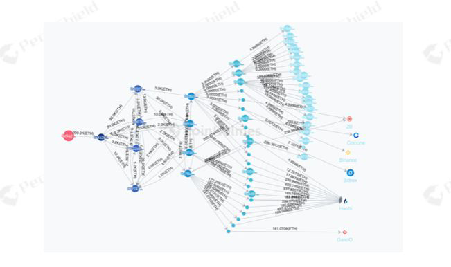可以看出,PeckShield 锁定监控的目标地址进行了多次周密的分散转移乃至混淆洗钱等操作,最终部分资金流入了交易所。