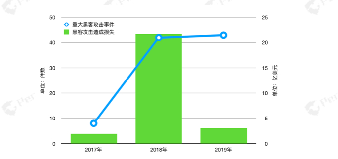 重大安全事件和损失情况:PeckShield 统计发现:2017年共发生重大安全事件11起,共计损失2.94亿美元; 2018年共发生重大安全事件46起,共计损失47.58亿美元。2019年共发生重大安全事件63起,总共损失达到了76.79亿美元。