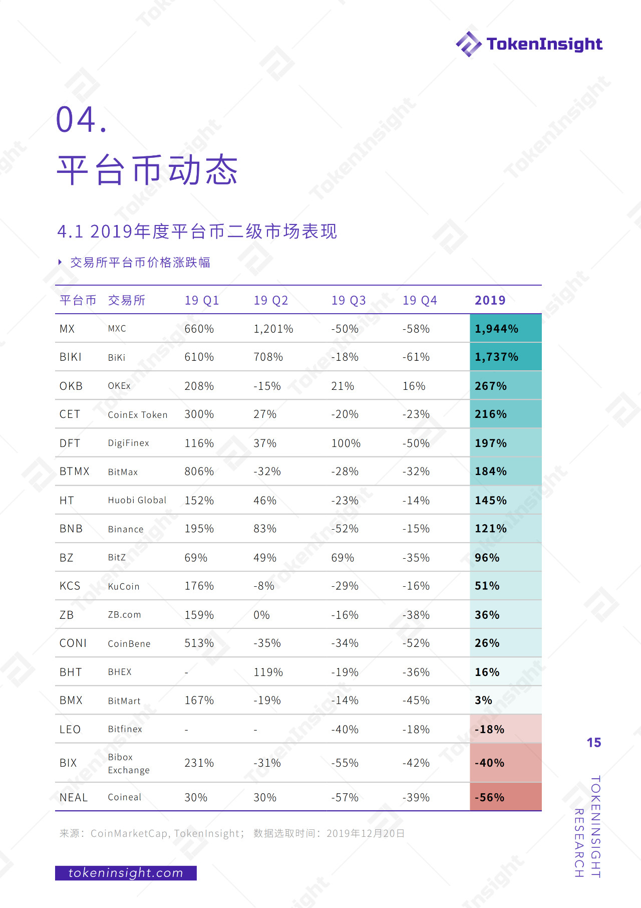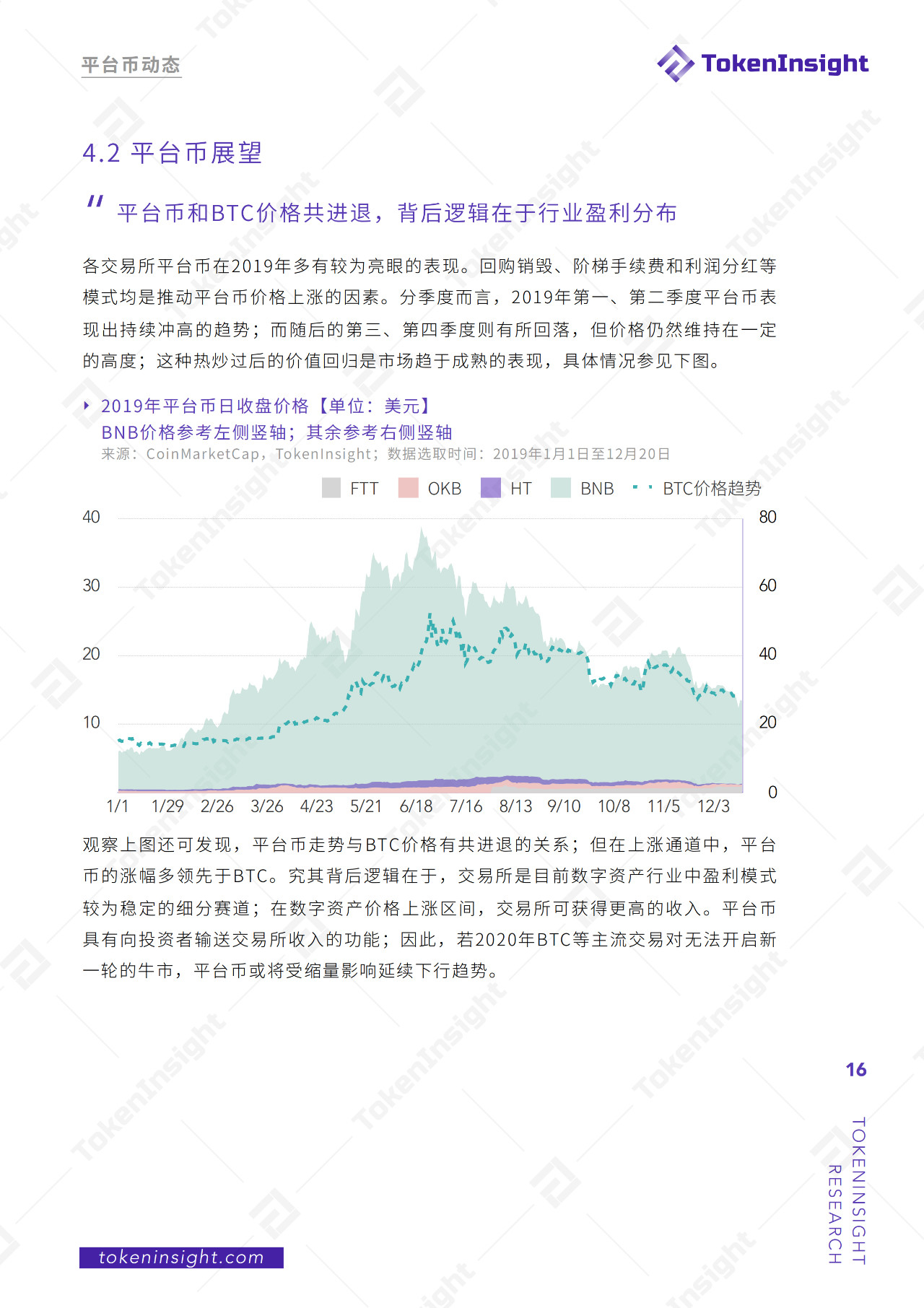 12. 受益于交易所盈利模式较为稳定的和产品特征,平台币在2019年多有较为亮眼的表现,但下半年多为价值回归。若2020年BTC等主流数字资产对无法开启新一轮的牛市,平台币或将受缩量影响延续下行趋势。