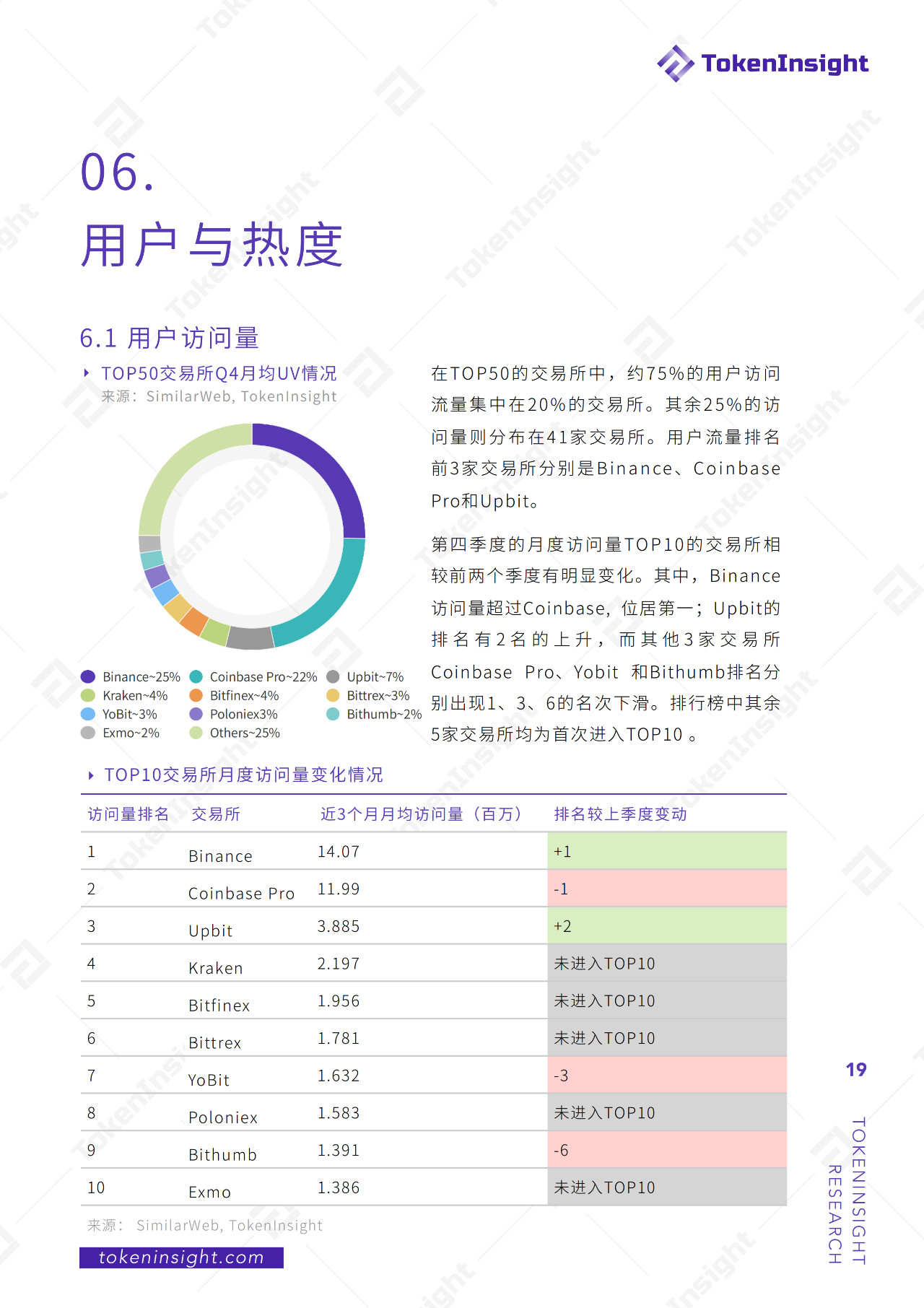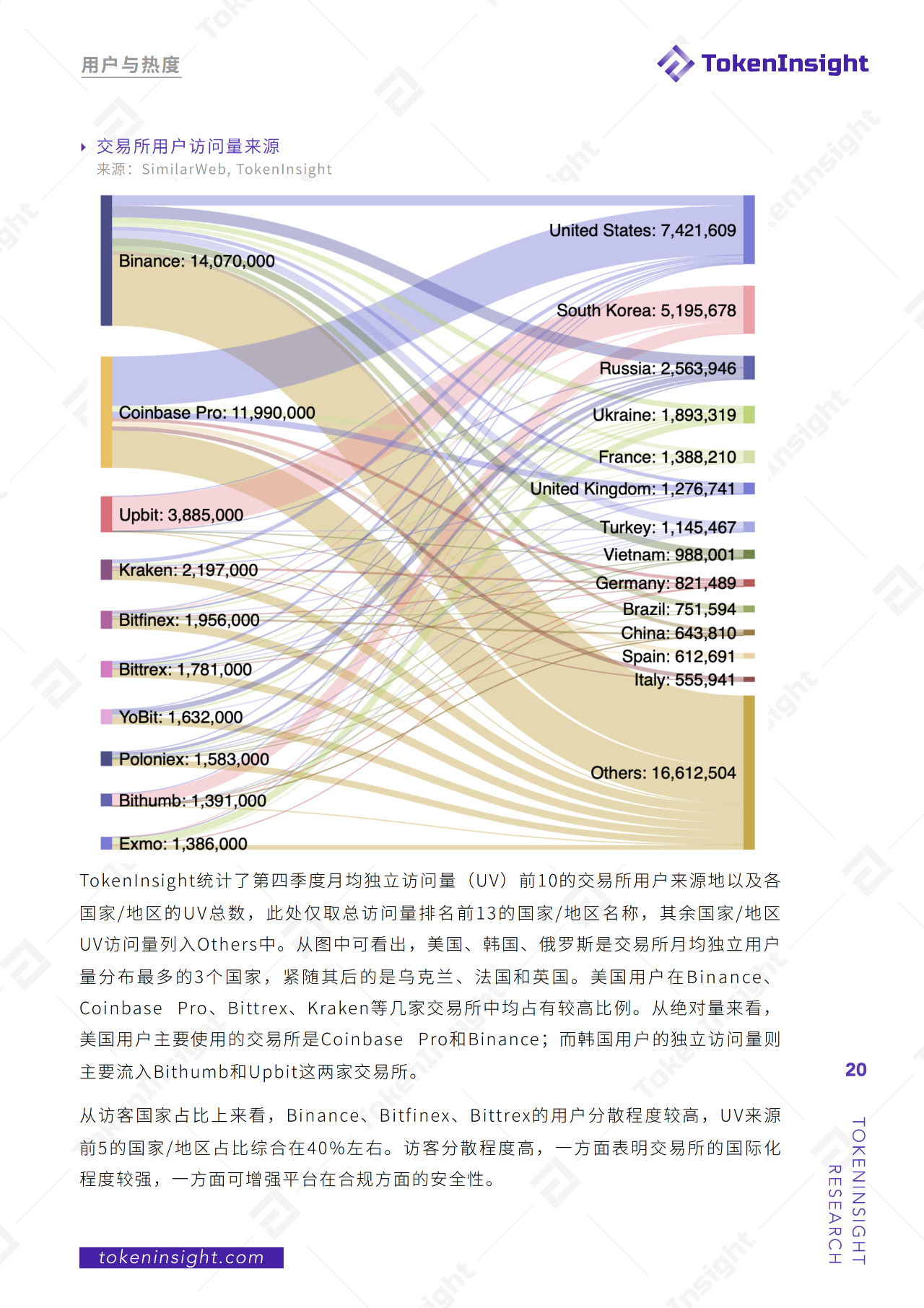 10. 2019年第四季度,独立访客数排名前3家交易所分别是Binance、Coinbase Pro和Upbit。美国、韩国和俄罗斯是全行业交易所月均独立用户最多的3个国家。