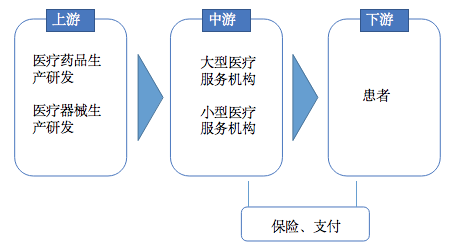 医疗保障不仅关乎每个社会成员的切身利益,更直接关系到一个国家的可持续发展与综合竞争力。医疗服务体系是一个包含从初级预防、门诊医疗、住院医疗、康复医疗的服务链,而支撑医疗服务链的是医药的研发、生产与销售体系和医疗保险费用筹集、支付体系,只有这三个体系良性协调运行,才能实现全社会的最大医疗保障和医疗资源的效用最大化。医疗产业链上游主要包括医疗药品生产研发和医疗器材生产研发;中游包括提供医疗服务的大型医疗机构和小型机构,大型机构主要是指公立医院和大型私立医院、药店连锁机构,小型机构是指社区医院和私人诊所等;医疗产业链的下游则是患者。