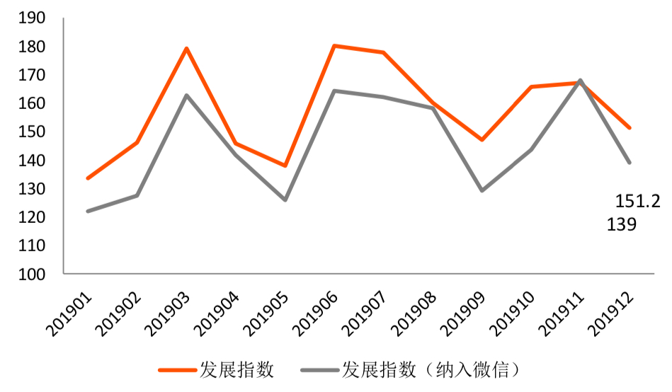 2017年1月微信搜索指数被纳入01GFI后,与发展指数(未纳入微信)同向变动,仅出现3次涨幅超过发展指数的现象,分别在2017年3月(181)、8月(194)和2019年11月(168)。