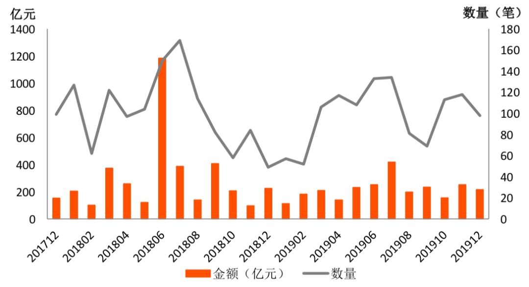 图5:2017.12~2019.12全球金融科技投融资月度走势