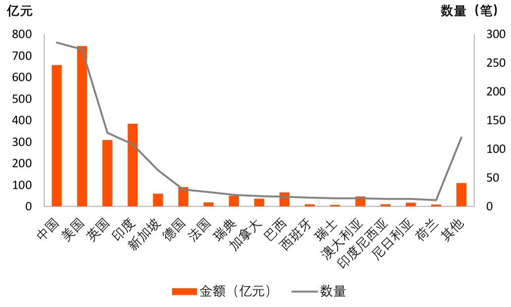图6:2019年各国金融科技领域融资数量和金额
