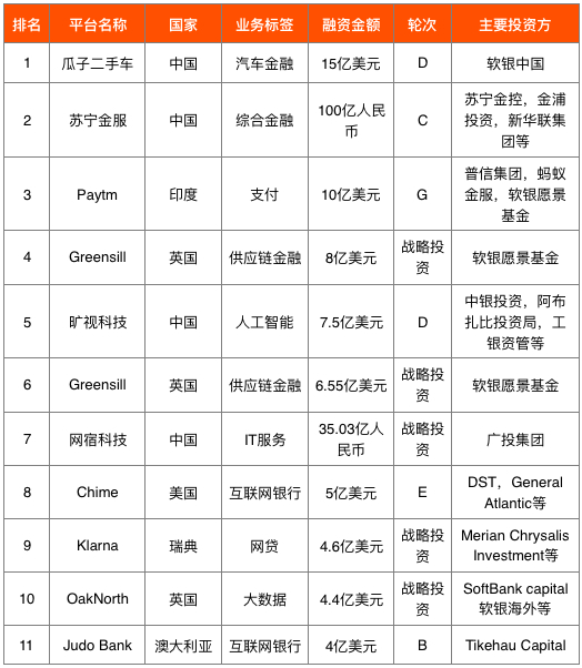 获得E、F、G轮的公司分别有19、6、2家:中国点融网获得1亿美元的F轮融资;印度移动支付平台Paytm完成10亿美元的G轮融资;美国数字贷款技术公司Blend获得1.3亿美元E轮融资。
