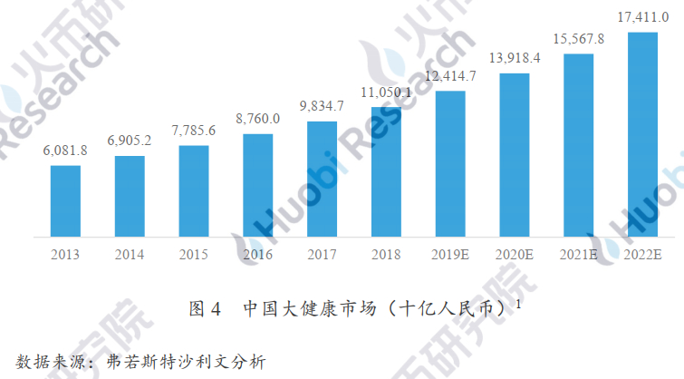 根据弗若斯特沙利文数据,2018年我国大健康产业规模达11万亿元,为2013年6万亿元的1.8倍,2013-2018年复合增长率达12.7%。弗若斯特沙利文预计2019年我国大健康市场总规模将达到12万亿以上,并于2022年增长至17万亿元,行业发展空间巨大。