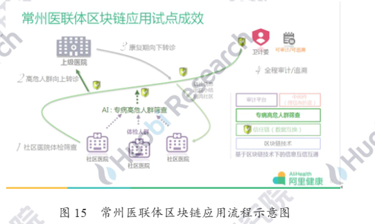 阿里健康“医联体 区块链”项目:2017年8月17日,阿里健康宣布与常州市开展“医联体 区块链”试点项目的合作,将区块链技术应用于常州市医联体底层技术架构体系中,预期解决长期困扰医疗机构的“信息孤岛”和数据隐私安全问题。
