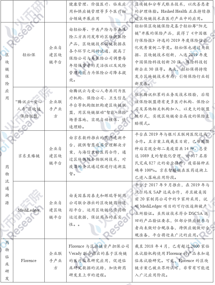 总体来说,区块链技术当前处于发展初期,用于处理维度复杂的医疗数据难度较高,因此在医疗健康领域的应用还尚未成熟,仅有部分公司或组织小范围地尝试。随着区块链技术发展走向成熟及医疗健康产业对区块链的进一步认识,区块链才能在医疗健康领域广泛应用。下文将对各个类型的应用案例进行简要介绍及分析。