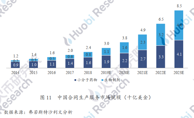 中国合同生产服务市场规模由2014年的12亿美元增至2018年的24亿美元,复合年增长率为19.8%,预期2023年将达到85亿美元。
