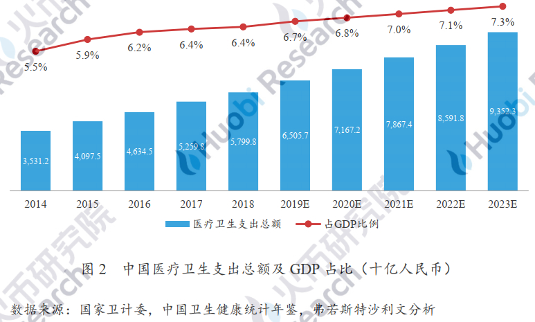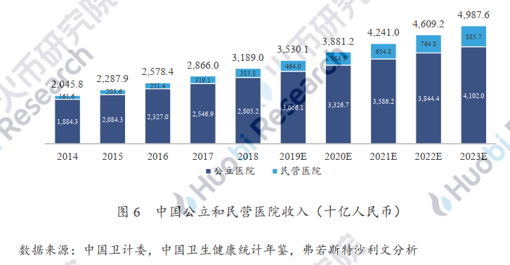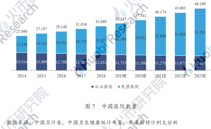 根据弗若斯特沙利文的数据,2018年中国公立和民营医院收入构成的市场规模接近3.2万亿元,保守估计到2023年市场规模将达到4.9万亿,医院市场规模不断扩大。