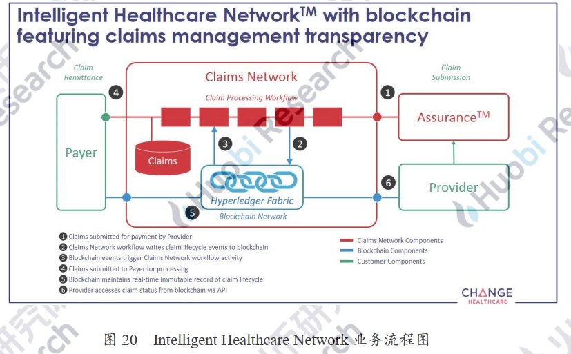 ChangeHealthcare于2018年1月推出了首个针对医疗健康的企业级区块链解决方案——Intelligent Healthcare Network™。利用区块链技术,医疗链条上的相关机构可以跟踪整个索赔过程中的索赔提交和款项收支的状态,提高了整个索赔链条的透明性、可审计性、可追溯性和可信度,更好地进行收入周期管理。区块链上使得整个流程以患者为中心,更加简单扁平,激发更多创新的产品及合作。