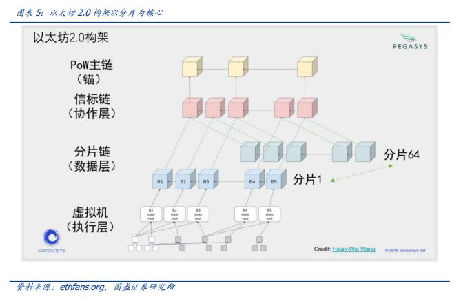 分片链是以太坊2.0网络未来可扩容性的核心特征,信标链是系统的中枢。在以太坊2.0规划中,信标链(Beacon Chain)是整个系统的中枢部分,通过权益证明Casper协议(Casper是整套系统的共识层,负责管理验证者,施行奖励和惩罚)并协调所有独立并行的分片链((Shard Chains)),通过交联(Crosslink)作为各分片的锚定点以实现跨分片通信,并为分片提供最终确定性保证。根据以太坊 2.0 规范,信标链将支持 64 个分片链,每条分片链上将有 128 个节点进行验证工作。分片是指:将某数据库(去中心化数据库或其他类型数据库)中许多节点的数据处理职责分割开,允许同时进行交易、存储和信息处理。分片理念与目前的以太坊主链模式完全不同,后者则需要每个全节点对每一笔交易进行处理和验证。可以简单这样理解,目前的比特币或者以太坊都是基于全网共识——对每一笔交易都进行全网见证,而为了提高性能,把整个网络分成一片片区域,每个片内部进行独立处理有限的数据业务,而分片之间的沟通协调则通过信标链来完成,从而带来性能的提升。这类似于将庞大的账本数据分散给多个服务器进行独立处理以提升速度,然后通过类似中心流量系统(即信标链)将服务器之间进行互联沟通,确保全网共识一致,账本能够有统一确定的结果。