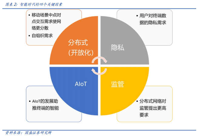 在一个拥有成规模用户的核心网络系统,当然存在云中心 终端模式的智能应用场景,但随着终端数据的隐私要求越来越高,网络边界的限制将越来越成为智能时代的障碍。在隐私需求和智能算法的发展下,终端必然朝着拥有更多自主性的方向去发展,网络由此变得分散化、开放化。终端之间的分布式组网会越来越降低对云中心的依赖,而进行点对点的通信与协作,毕竟AIoT赋予了终端智能,产生于终端的数据价值有待进一步挖掘。在隐私需求和智能算法的发展下,终端必然朝着拥有更多自主性的方向去发展,网络由此变得分散化、开放化。终端之间的分布式组网会越来越降低对云中心的依赖,而进行点对点的通信与协作,毕竟AIoT赋予了终端智能,产生于终端的数据价值有待进一步挖掘。