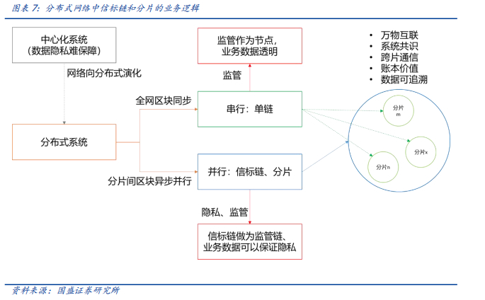 分片的思路类似边缘计算 异步并行网络,为分布式网络提供共识、账本价值、隐私保护和监管友好等优势。一方面,分片解决了分散节点的组网问题,边缘计算终端可以方便地根据需求进行终端组网,分片内部的共识规则为分片内节点的智能自组织提供了基础平台;分片之间的异步并行机制为网络带来足够性能的分布式和扩展性。另一方面,信标链则为全网共识、跨片通信提供中枢机制,还有一层更有意思的是,信标链为监管和分片业务分离提供了基础——信标链完全可以给监管开放接口,而不会干扰分片内部业务的数据隐私问题。除了信息沟通之外,系统可以利用区块链分布式账本实现终端之间的价值转移,这是为系统引入了金融属性,例如支付、资产数字化甚至交易。